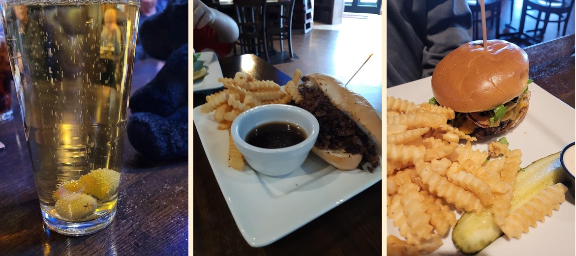 The drink menu features excellent cocktails and a wide selection of beers. Happy hour specials make drinks affordable. Options include local brews and seasonal favorites like Santa’s Hat Margarita.
